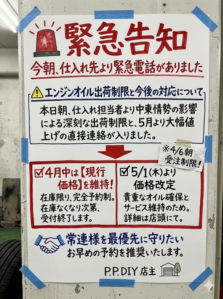 中東情勢の悪化に伴い、ついにエンジンオイルの「深刻な出荷制限(受注制限)」と「5月からの大幅値上げ」が決定したとのことです。